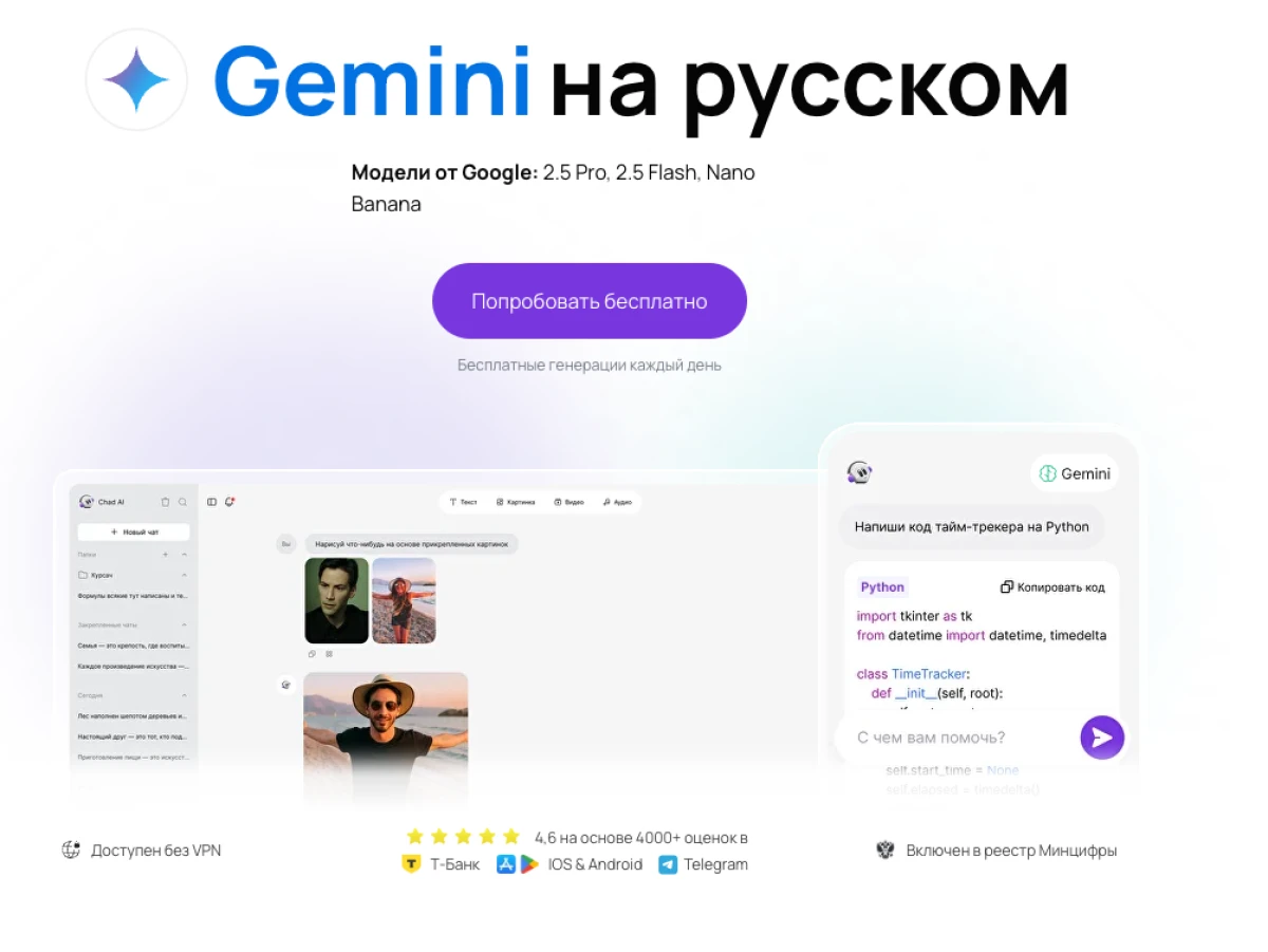 Для российских пользователей прямой доступ к сервисам Google с Gemini затруднён, однако воспользоваться моделью можно через российский портал Chad. Платформа предоставляет доступ к популярным нейросетям, в том числе Gemini, по подписке с несколькими тарифами, которые отличаются лимитами по количеству слов, числу запросов и набору функций. Регистрация на Chad упрощена, поддерживается авторизация через социальные сети, интерфейс полностью русскоязычный.
