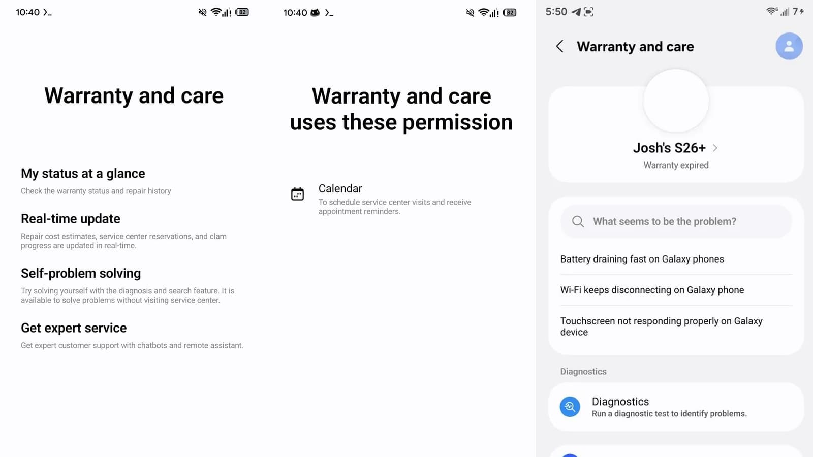 Ключевая задача Warranty & Care — упростить взаимодействие владельцев Galaxy с сервисной экосистемой Samsung. В приложении можно будет посмотреть статус гарантии устройства, найти решения типовых проблем, предварительно оценить стоимость ремонта, онлайн записаться в сервисный центр и отслеживать ход обращения и работ в режиме реального времени. Предусмотрены и быстрые переходы к аппаратной диагностике через Samsung Members.
